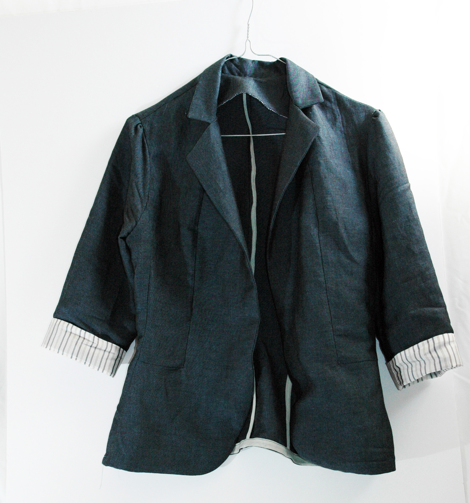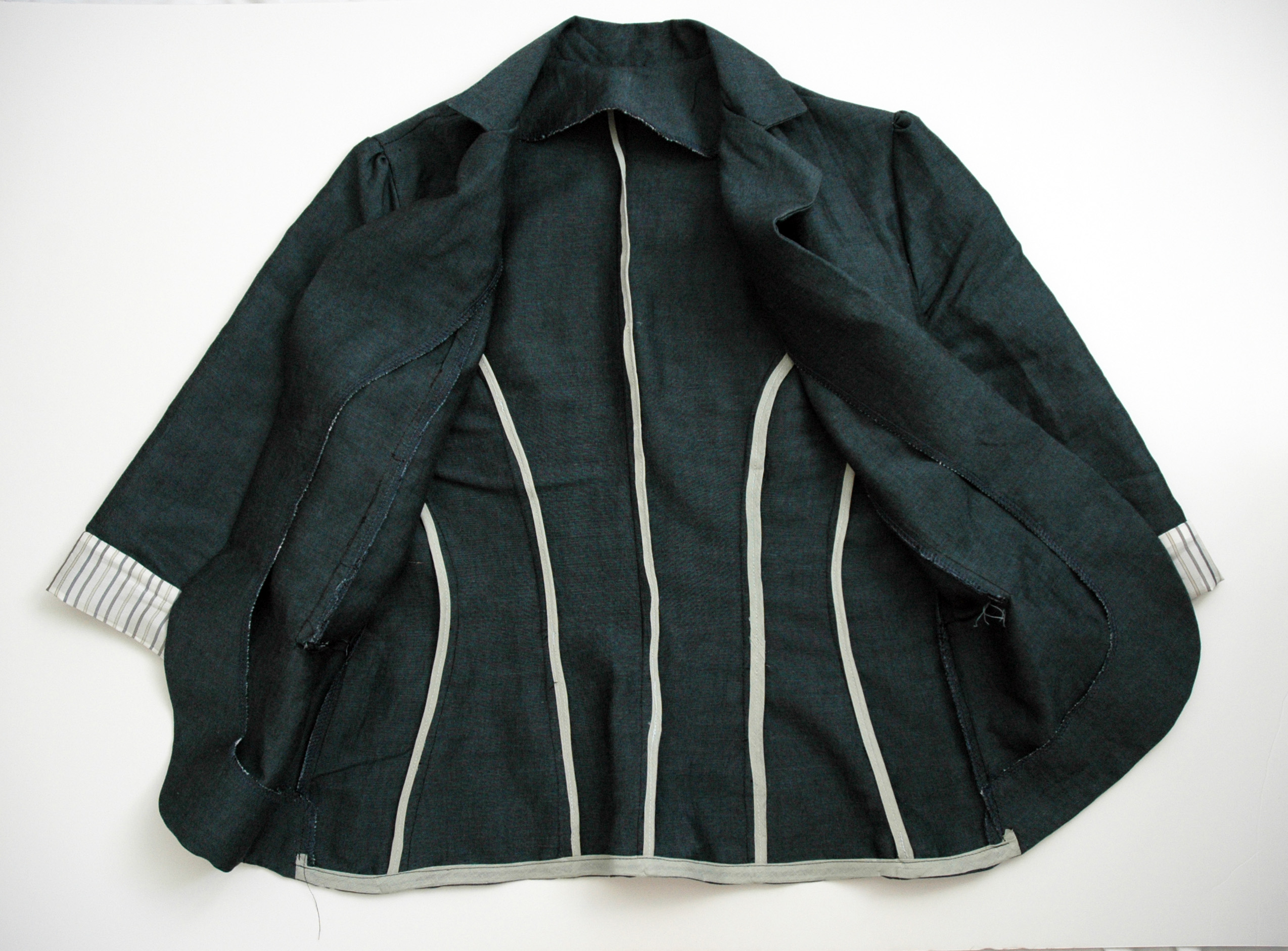 So I made the new jacket from linen and did not use jacket lining except for the sleeves. I love jackets that have colorful or striped linings inside. For this jacket I used striped lining with soft colors for the sleeves. Also, I wanted to use the sleeves folded so that the lining would be visible. Since I did not use lining for the jacket, I used greyish bias binding tape to give a cleaner look inside the jacket.