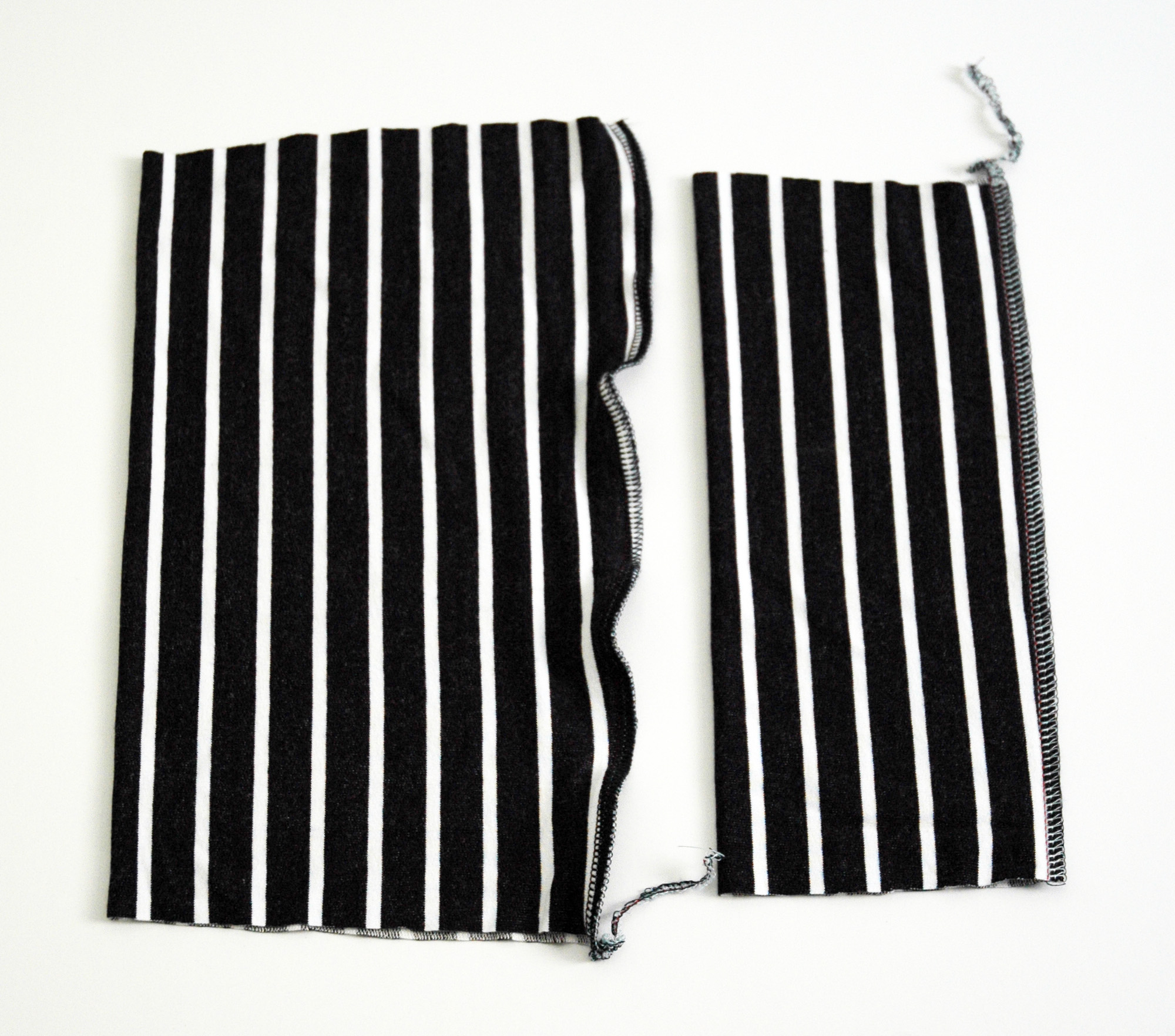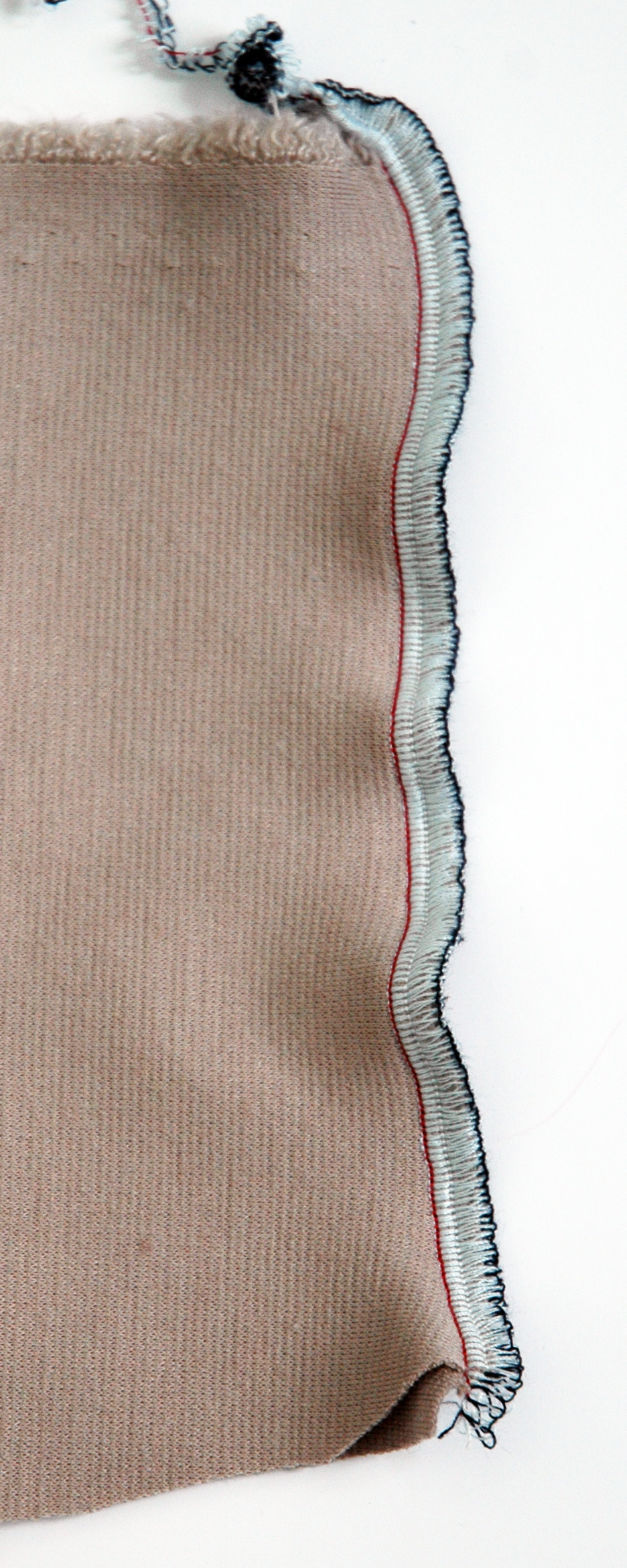 – On the left side of my serger, I have the differential feed adjusting knob. Mine starts from 0.7 and then goes to N (Neutral) and continues to 1.5 and to 2. The differential feed adjusts the feed dogs and so influences the gathering and stretching of your fabric. In some fabrics, this does not make much of difference. For instance, I tried it on linen and cotton and whether it was on 0.7 or 2 did not make such a difference. However, once I tried it on stretchy knit fabric, there was a huge difference. Below are the results, the one on the left is 0.7 and the one on the right is 1.5.