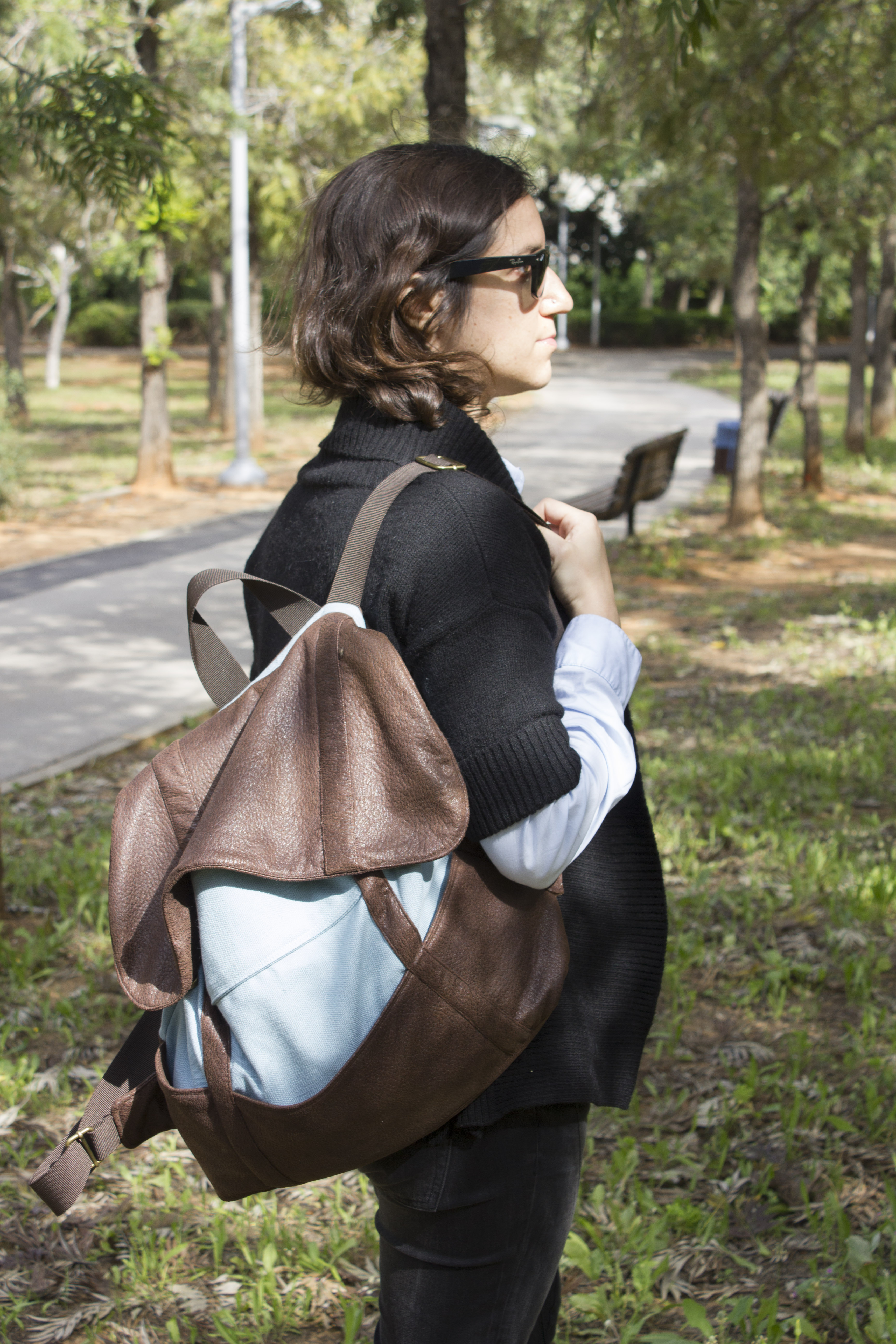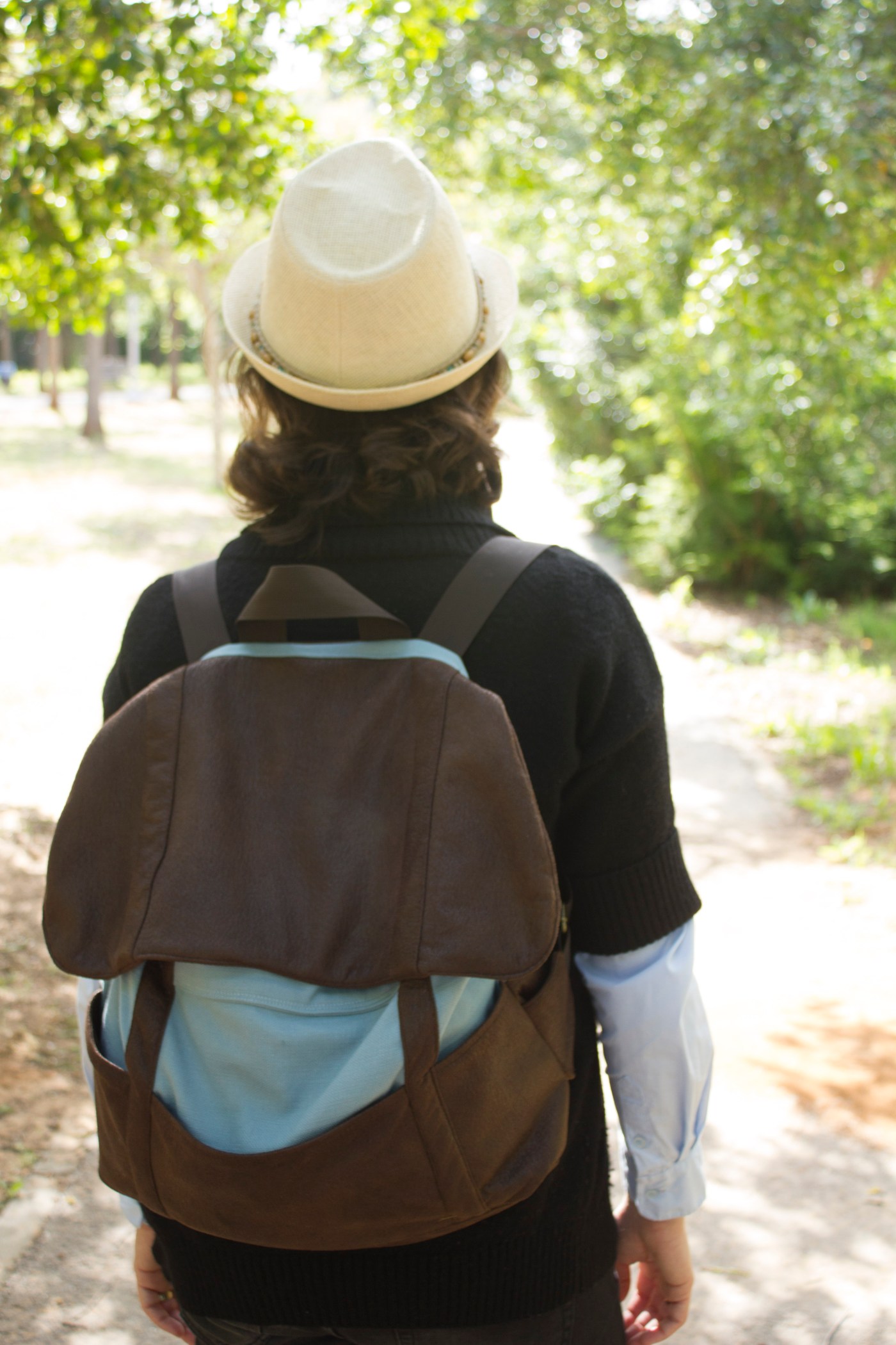 For this backpack, I used light blue thick cotton for the main body and soft fake leather for the flap, the gusset and the rest. For the lining, I preferred a more colorful and fun fabric which was light cotton. All the fabric was bought at local stores in Tel Aviv.
